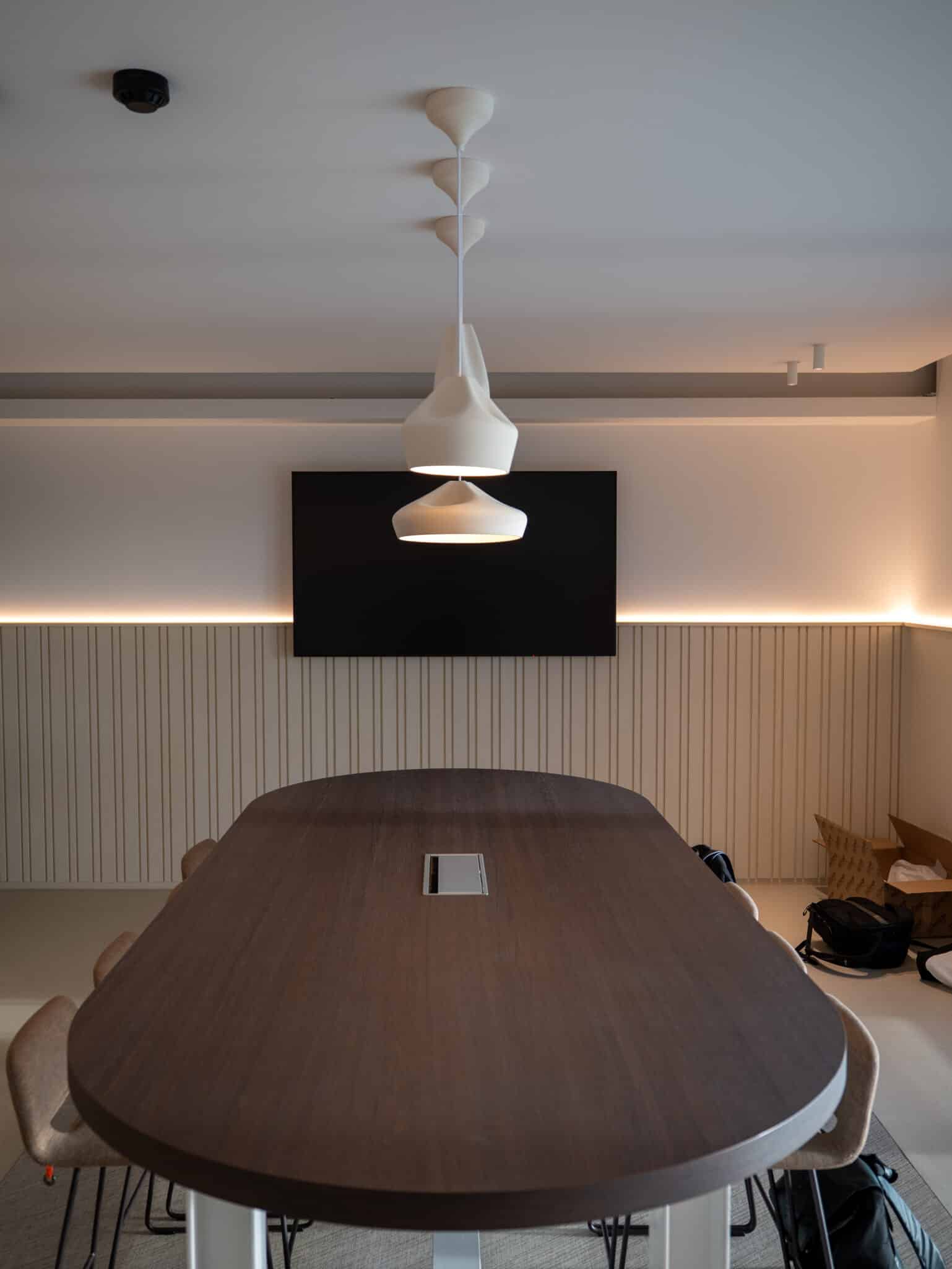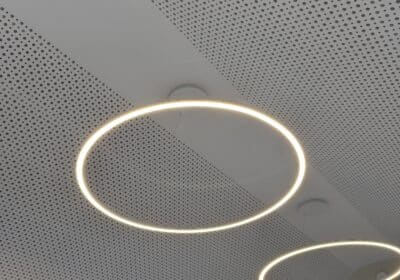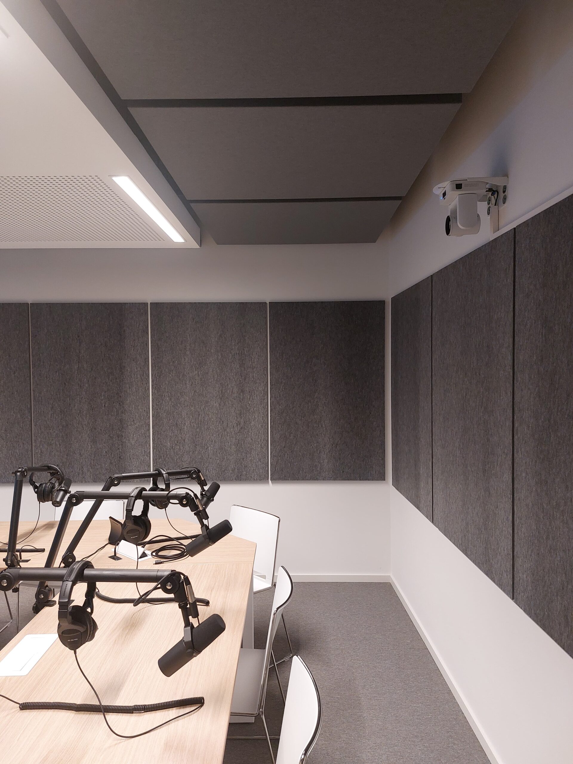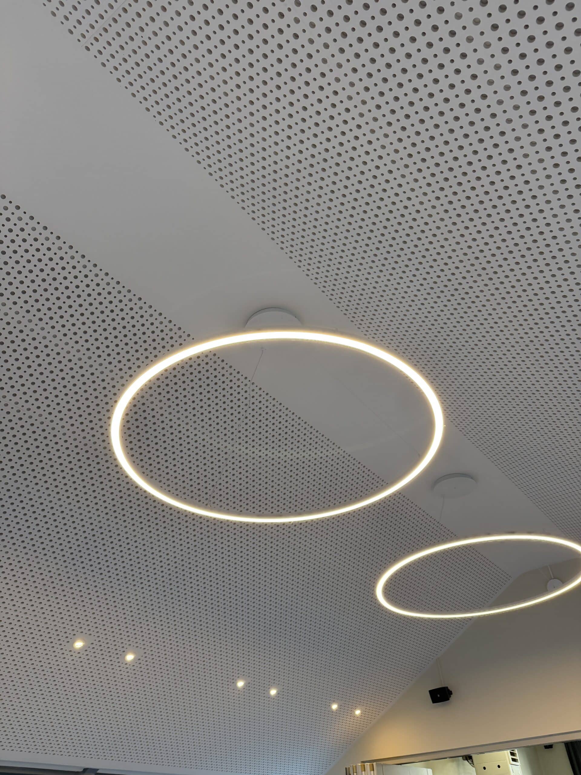 Réalisation d'un plafond tendu acoustique avec intégration de nombreuses techniques (luminaires haut de gamme, alarme incendie, wifi)