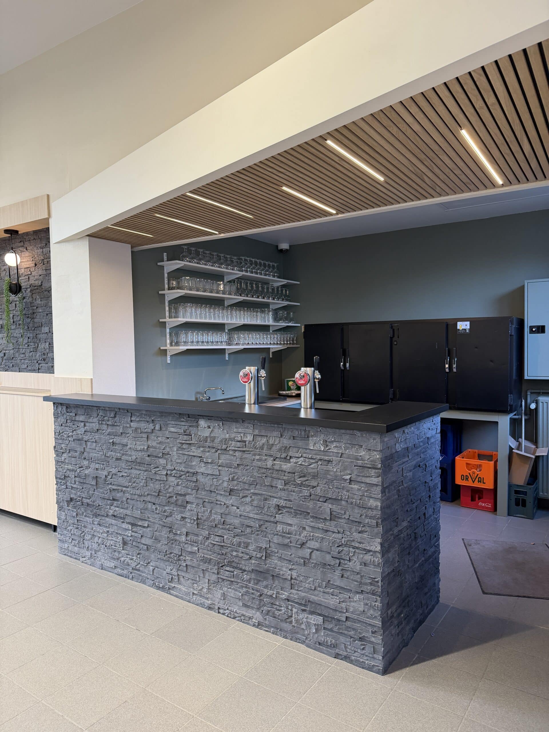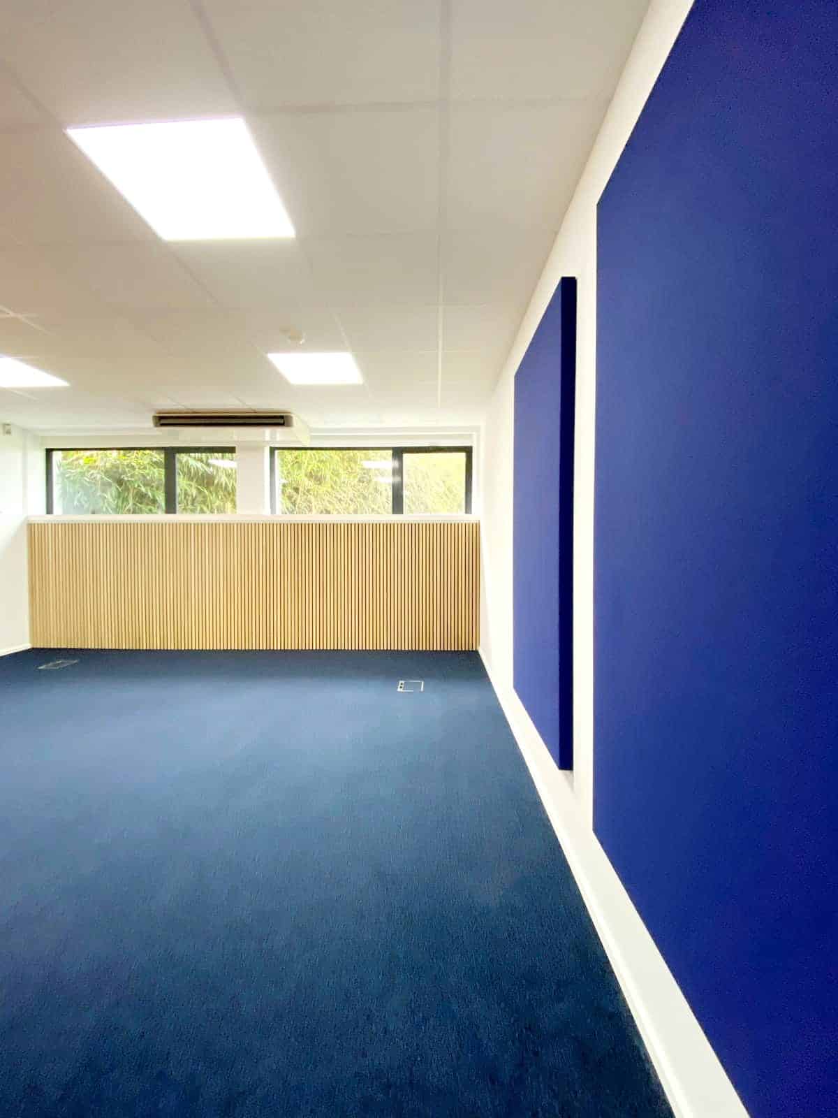 Pose d'un bardage bois acoustique dans plusieurs salles de réunion ainsi qu'un réfectoire