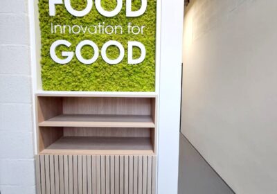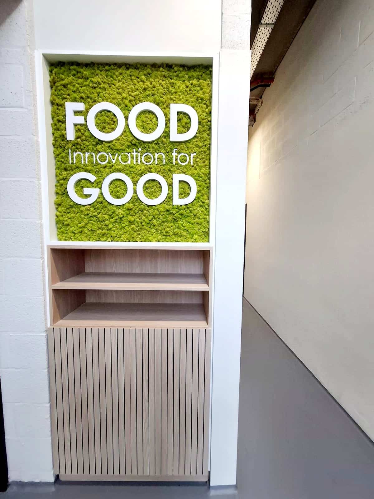 Aménagement du sas d'entrée avec pose sur lattage pour réintégrer les techniques. Bardage bois chêne clair + zone végétale et logo en PVC